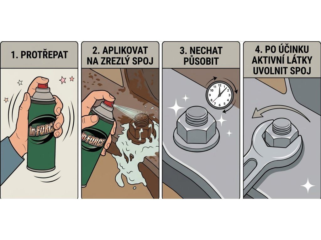 Použití: Sprej důkladně protřepejte a naneste na spoj, který potřebujete uvolnit - nechte prostředek působit, popřípadě poklepejte nebo aplikujte opakovaně. Aktivní látka má mazací a antikorozní účinky a pomáhá s uvolněním špatně povolitelných spojů. Díky aplikační jehle lze aplikovat i do těžko přístupných míst.